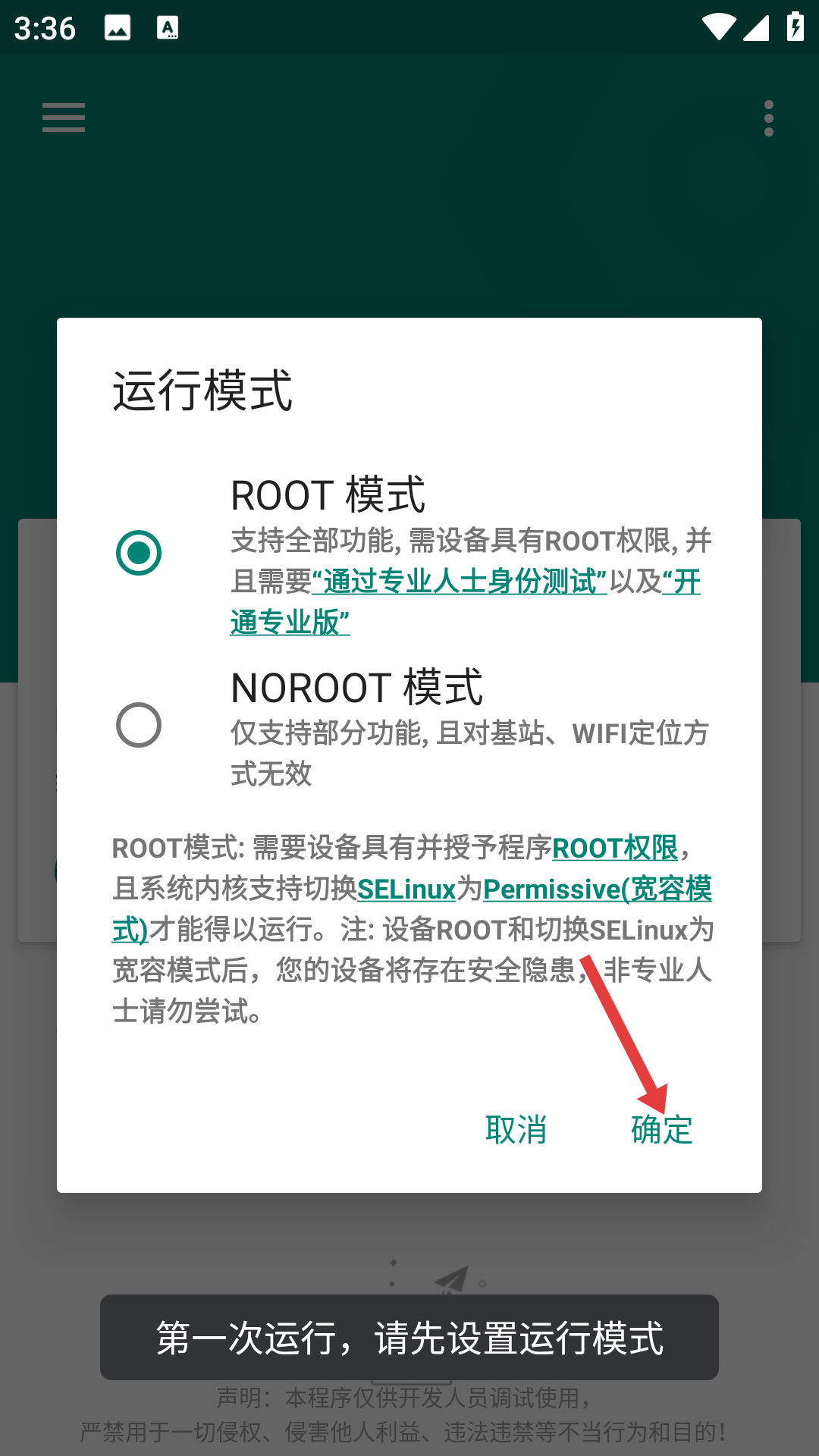 2、首次啟動模擬會彈出運行模式選擇框,有ROOT模式和NOROOT模式,若設備已ROOT且想全功能模擬就選ROOT模式,點擊確定確定應用運行的權限基礎。