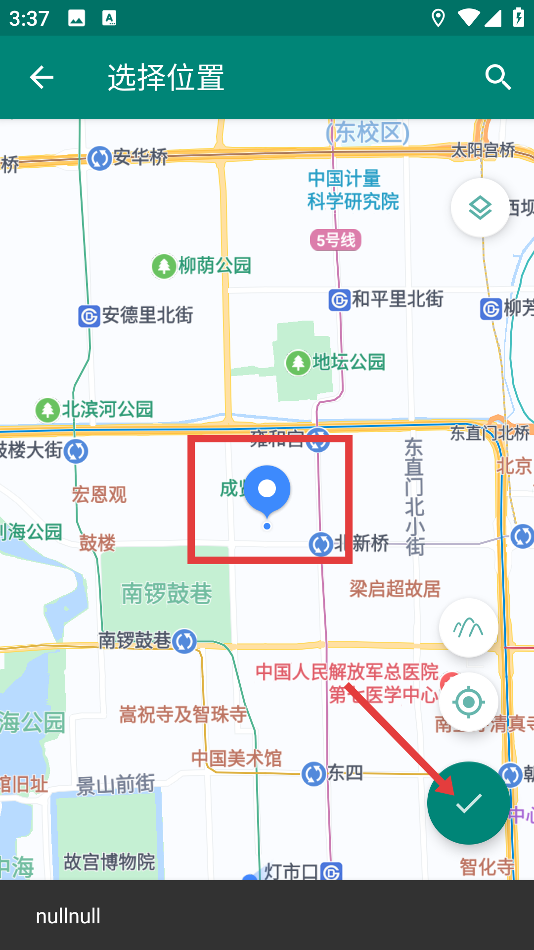 3、確定運行模式后進入選擇位置地圖頁面,地圖上藍色標記是可模擬的定位點,選好后點擊右下角確認按鈕,將該位置設為模擬目標,讓應用知曉要模擬到哪。