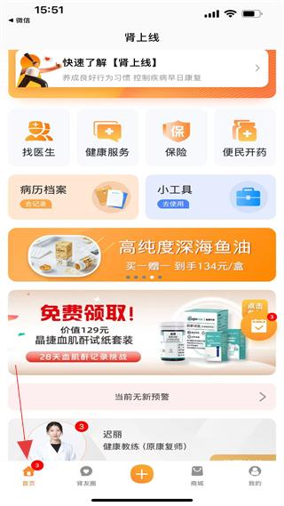 1、首頁有找醫生、健康服務等功能,還有深海魚油、血肌酐試紙套裝等健康產品,助力腎病患者健康管理,服務與產品豐富。