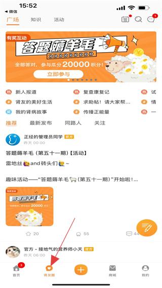 2、腎友圈有答題薅羊毛等有獎互動,還有腎友分享的生活與腎病故事,營造互助交流氛圍,給患者情感與知識支持。