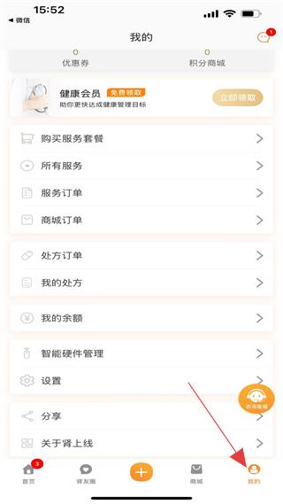 4、我的板塊可查看優惠券、積分商城,還有服務訂單、商城訂單等管理功能,助力患者管理個人健康服務與消費。