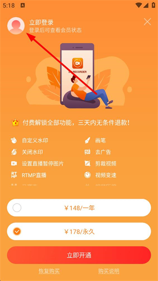 1、打開應用后會看到立即登錄提示,登錄后可查看會員狀態,還有付費解鎖全部功能的選項,可選一年或永久套餐,完成登錄才能繼續后續操作。