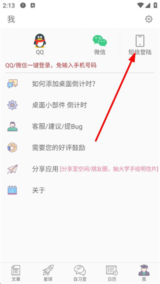 2、我的界面,提供QQ、微信、短信等登錄方式,還有添加桌面倒計時、客服咨詢等功能選項,可通過這些功能獲取幫助或分享應用。