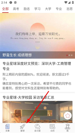 1、進入平臺主界面,頂部有全部、高考等分類標簽,展示著大學專業相關文章內容,底部有文章、星球等功能入口,點擊我可進入個人相關界面。