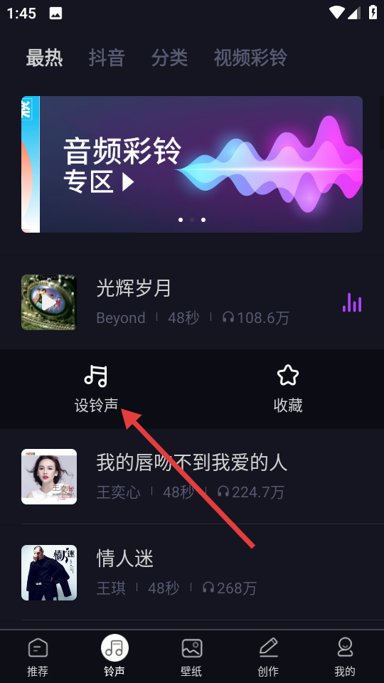 1、進入鈴聲頁面后你會看到眾多鈴聲選項,找到你心儀的鈴聲后,點擊該鈴聲下方的設鈴聲按鈕,這是設置鈴聲的第一步操作,點擊后會彈出相關設置選項。