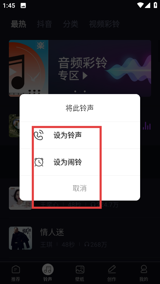 2、點擊設鈴聲后會彈出一個選擇框,里面有設為鈴聲、設為鬧鈴和取消三個選項,根據你的需求想將其設為來電鈴聲,就點擊設為鈴聲,想設為鬧鈴就點擊設為鬧鈴即可。
