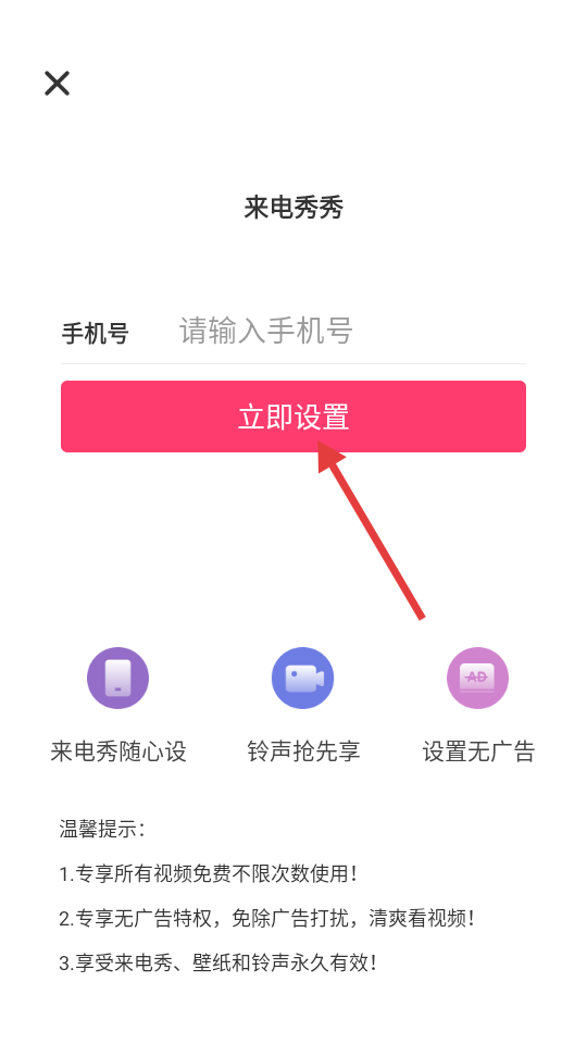 3、在來電秀設置頁面先在手機號輸入框中輸入你的手機號,然后點擊下方醒目的紅色立即設置按鈕,這樣就能完成來電秀的設置流程,享受來電秀帶來的個性化體驗。