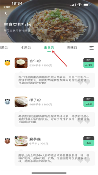 1、主食類榜單有杏仁粉、椰子粉、魔芋絲,杏仁粉是高蛋白低碳水的面粉替代物,椰子粉適合生酮期烹飪,魔芋絲低卡低脂助控碳。