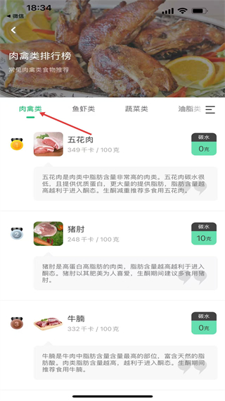 3、肉禽類榜單有五花肉、豬肘、牛腩,五花肉低碳水高脂肪助生酮,豬肘高蛋白高脂肪利酮態,牛腩脂肪高適合生酮期食用。