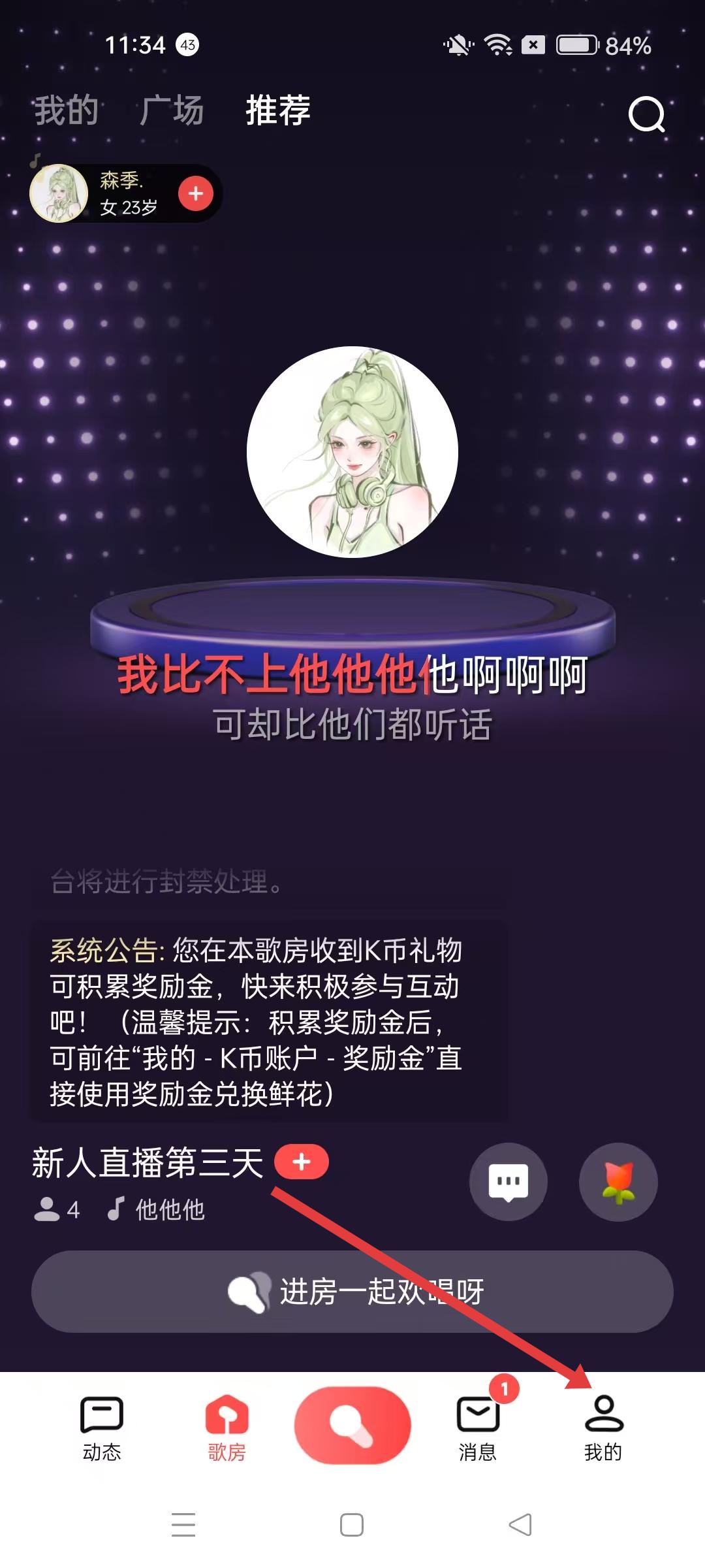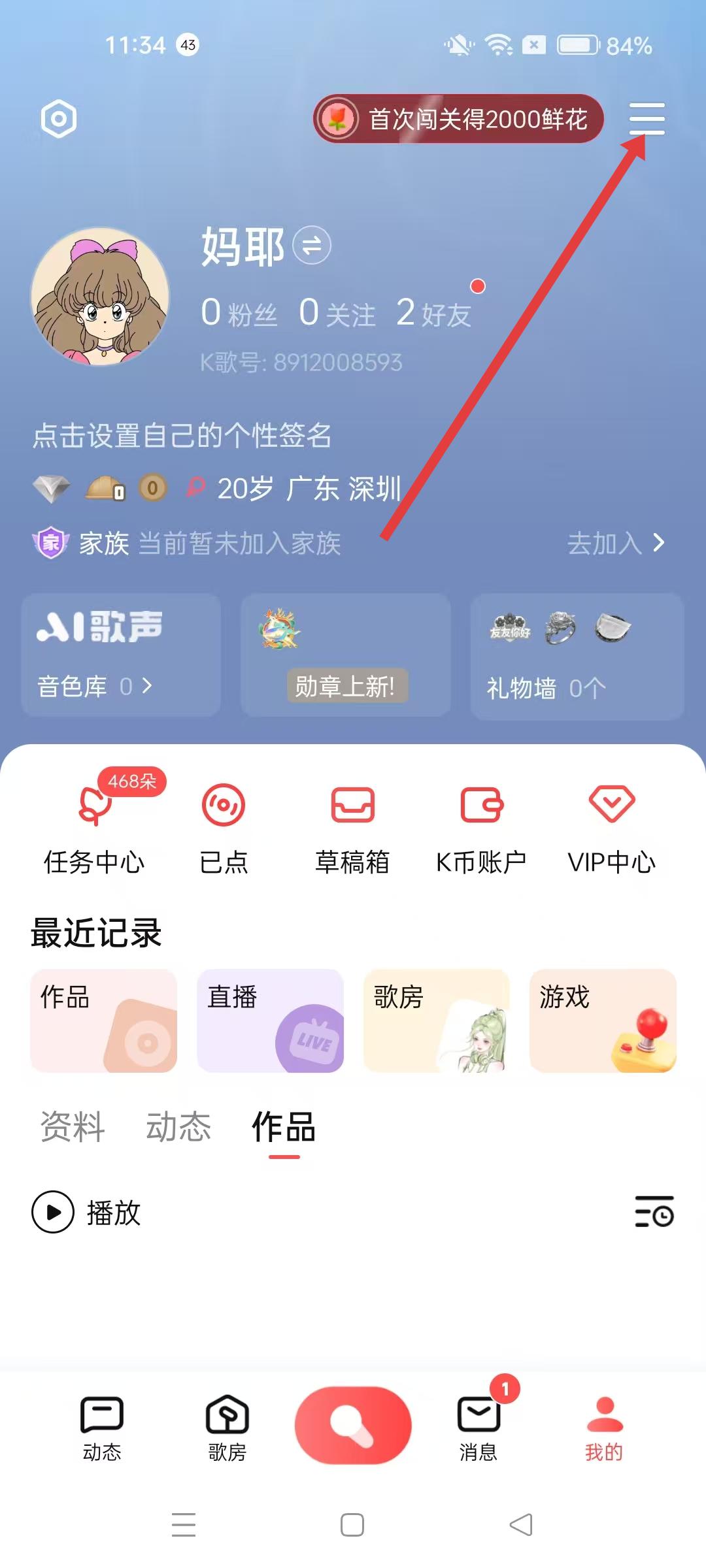 1、打開全民K歌APP,點擊底部我的進入個人頁面,可查看粉絲、功能入口及最近記錄等內容。