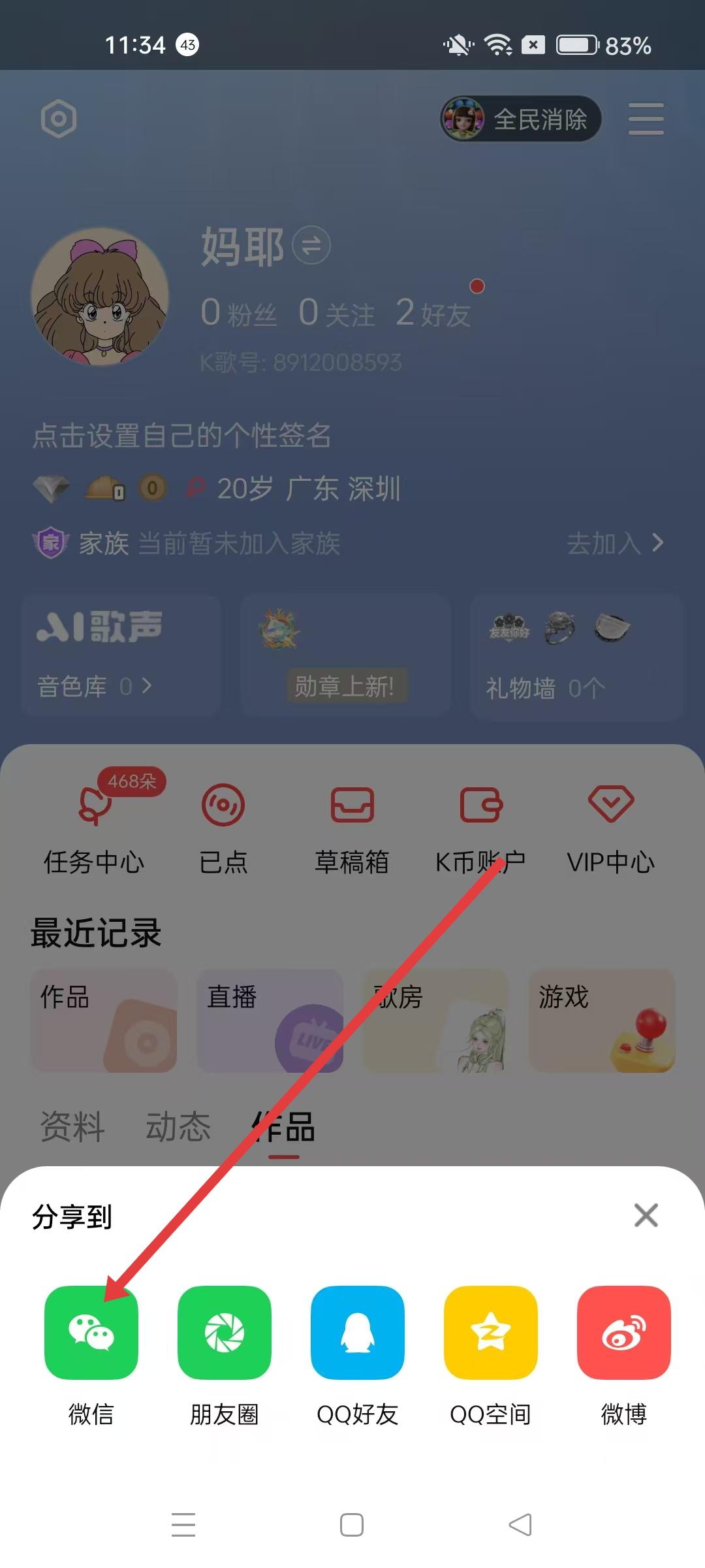4、分享界面選擇微信、QQ等平臺,即可將全民K歌內容分享給好友。
