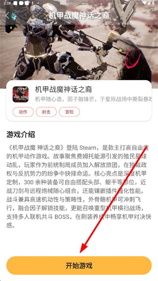 2、游戲介紹界面,能看到游戲的類型為動作、射擊、冒險,了解游戲背景和核心亮點后,點擊開始游戲進入下一步。