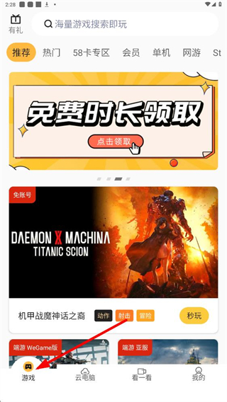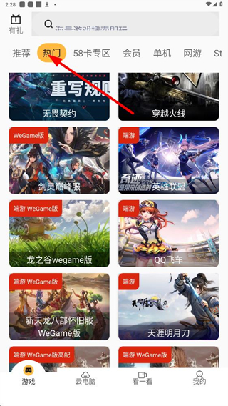 4、若想玩熱門游戲,可點擊熱門標簽,里面有無畏契約、穿越火線等多款熱門游戲,可選擇感興趣的游戲進行體驗。