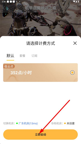 3、選擇計費方式界面,有默認、套餐、訂閱三種選擇,默認計費方式為352極云點每小時,選擇后點擊立即啟動即可開始游戲。