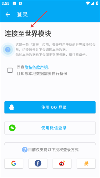 1、登錄界面說明應用為離線型,登錄僅用于訪問特定模塊,本地數據需自行備份,支持QQ、微信等授權登錄,需勾選隱私條款。