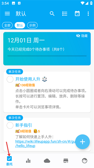 2、委托頁展示當日待辦進度,任務可點擊圓圈或右滑完成,長按可操作,單擊看詳情,加號按鈕可添加新任務。
