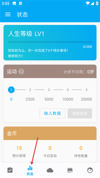 3、狀態頁展人生等級等成長數據,含運動計步(可手動輸數據)、金幣統計,助力追蹤個人成長進度。