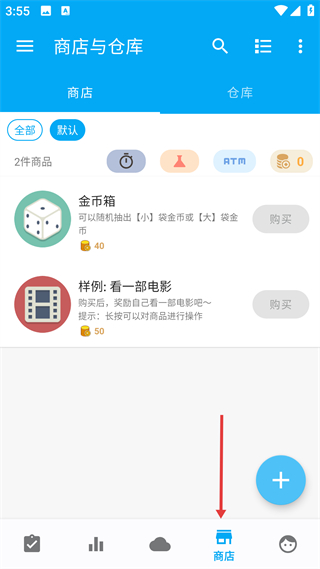 4、商店頁提供金幣箱等商品,需用金幣購買,倉庫管已購商品,長按可操作,加號按鈕可添加商品,是權益管理界面。