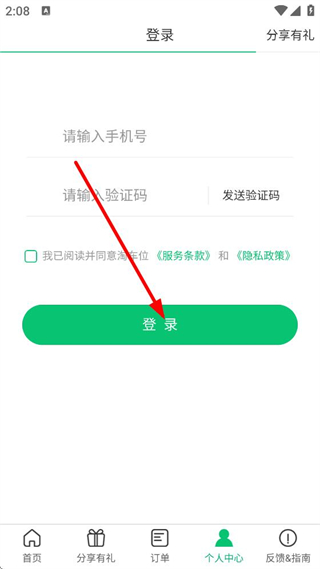 2、進入登錄界面,輸入手機號后獲取驗證碼,勾選服務條款與隱私政策,點擊登錄按鈕完成賬號登錄操作。