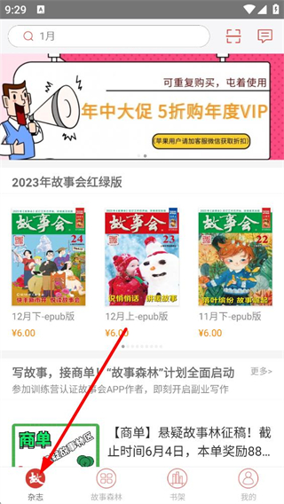 1、打開故事會APP進入雜志板塊,可看到2023年故事會紅綠版多期雜志展示,還有年中促5折購年度VIP活動入口,可瀏覽雜志和參與活動。