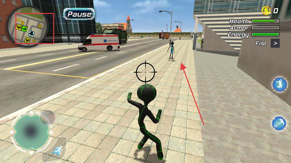 3、操控火柴人在城市街道移動,遇到其他角色時,可選擇與他們互動或戰斗,同時注意左上角的地圖,了解所處位置和目標方向。