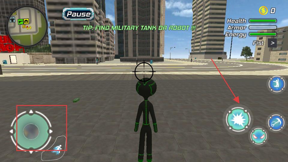 2、在都市冒險場景中利用左側的虛擬搖桿操控火柴人移動,右側的攻擊按鈕讓火柴人發起攻擊,探索城市并應對可能的敵人。