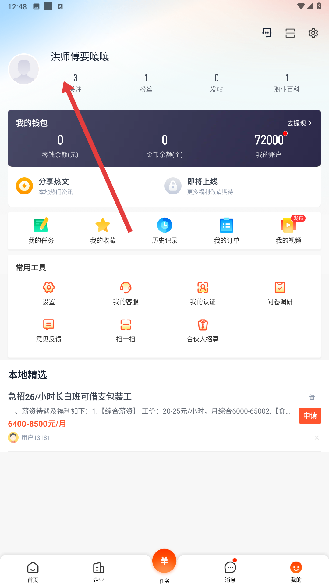 4、登錄成功后,進入我的頁面,可查看到關注、粉絲、發帖、職業百科數量,還有我的錢包、分享熱文等功能入口,也能使用常用工具和查看本地精選招聘信息。