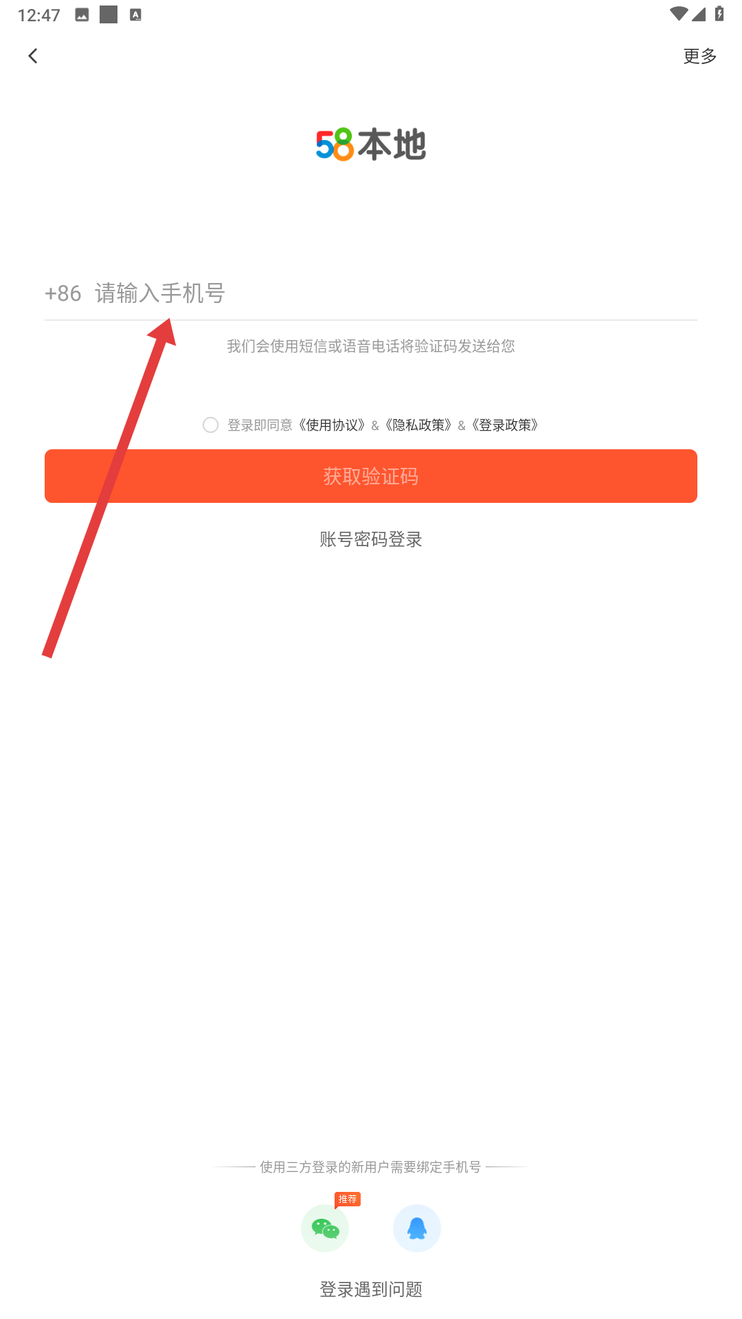 2、登錄界面輸入手機號,勾選登錄即同意使用協議、隱私政策、登錄政策,點擊獲取驗證碼。