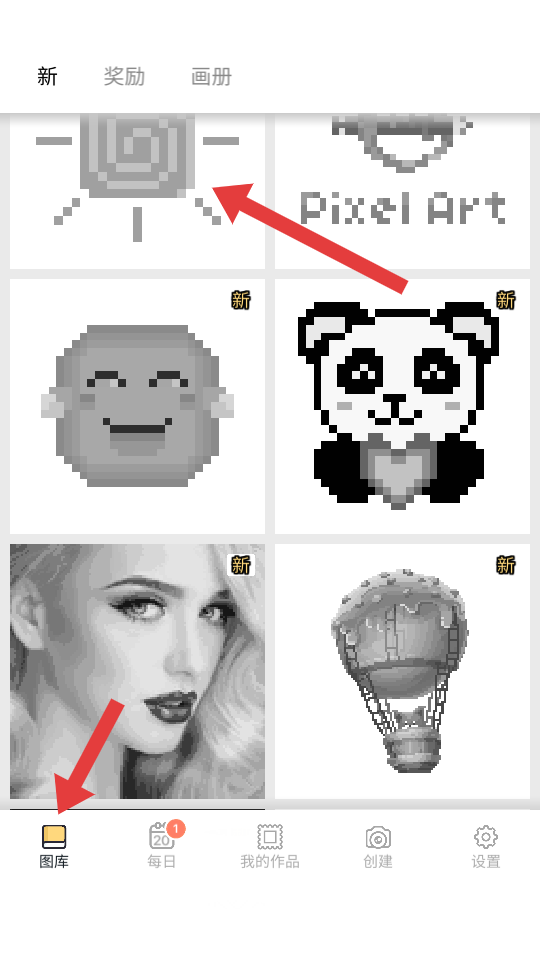1、進入游戲,在圖庫里選擇想要填色的像素畫圖案,開啟有趣的填色創作之旅。