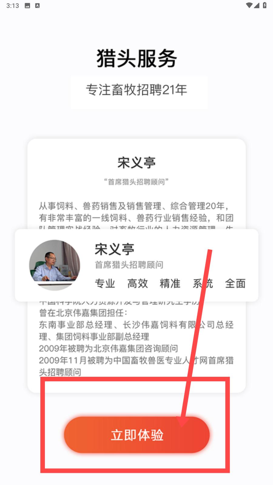 2、進入這個界面后,跟隨箭頭的指引,將視線移到下方,點擊立即體驗,跳轉到下一個界面。