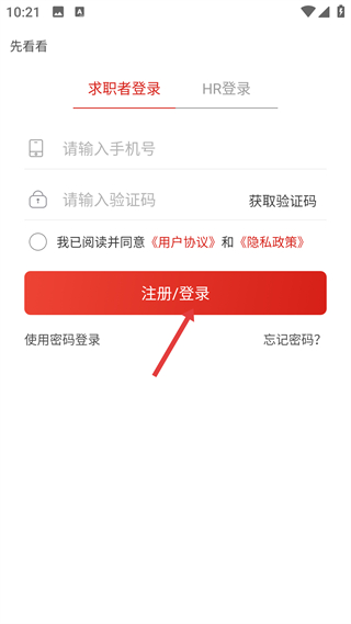 1、進入登錄頁選求職者身份,輸手機號獲驗證碼,勾選協議后點注冊/登錄,也可選密碼登錄方式,完成賬號登錄。