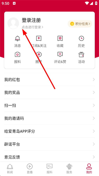 1、進入愛青島首頁,可瀏覽頭條熱點等分類的資訊內容,底部有新聞直播等功能入口,點擊我的選項,即可進入個人中心頁面。