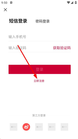 3、進入登錄界面默認顯示短信登錄方式,可輸入手機號獲取驗證碼完成登錄,也能點擊立即注冊進入新用戶注冊流程,還支持第三方登錄。