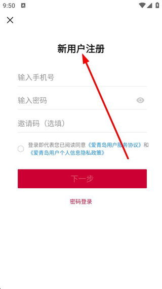 4、進入新用戶注冊界面后,輸入手機號設置密碼,可選填邀請碼,勾選相關協議后點擊下一步,即可完成新用戶的注冊操作。