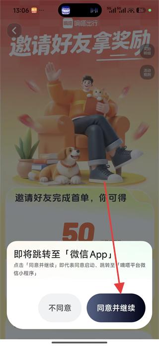 4、點擊后彈出即將跳轉至微信App的提示框,點擊同意并繼續,跳轉至微信,進行好友邀請操作。