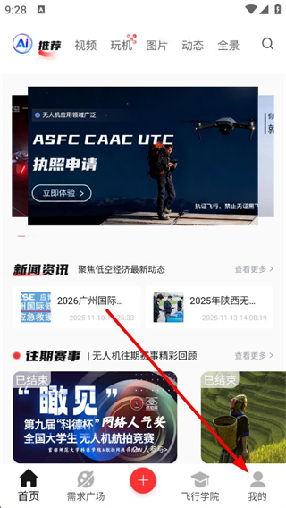 1、進入應用首頁可看到導航欄含推薦視頻玩機等選項,還有無人機執照申請入口,以及新聞資訊往期賽事板塊,可瀏覽低空經濟動態或賽事回顧。