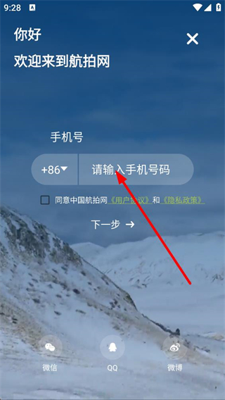 2、點擊我的進入登錄界面,界面顯示歡迎語,可選擇輸入手機號并勾選協議后點下一步,也能通過微信QQ微博等方式登錄。