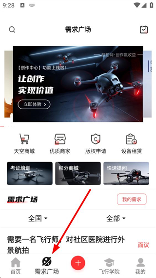 4、登錄后點擊需求廣場,可看到天空商城優質商家等功能入口,還能瀏覽全國范圍內的需求,比如尋找航拍飛行師的任務。