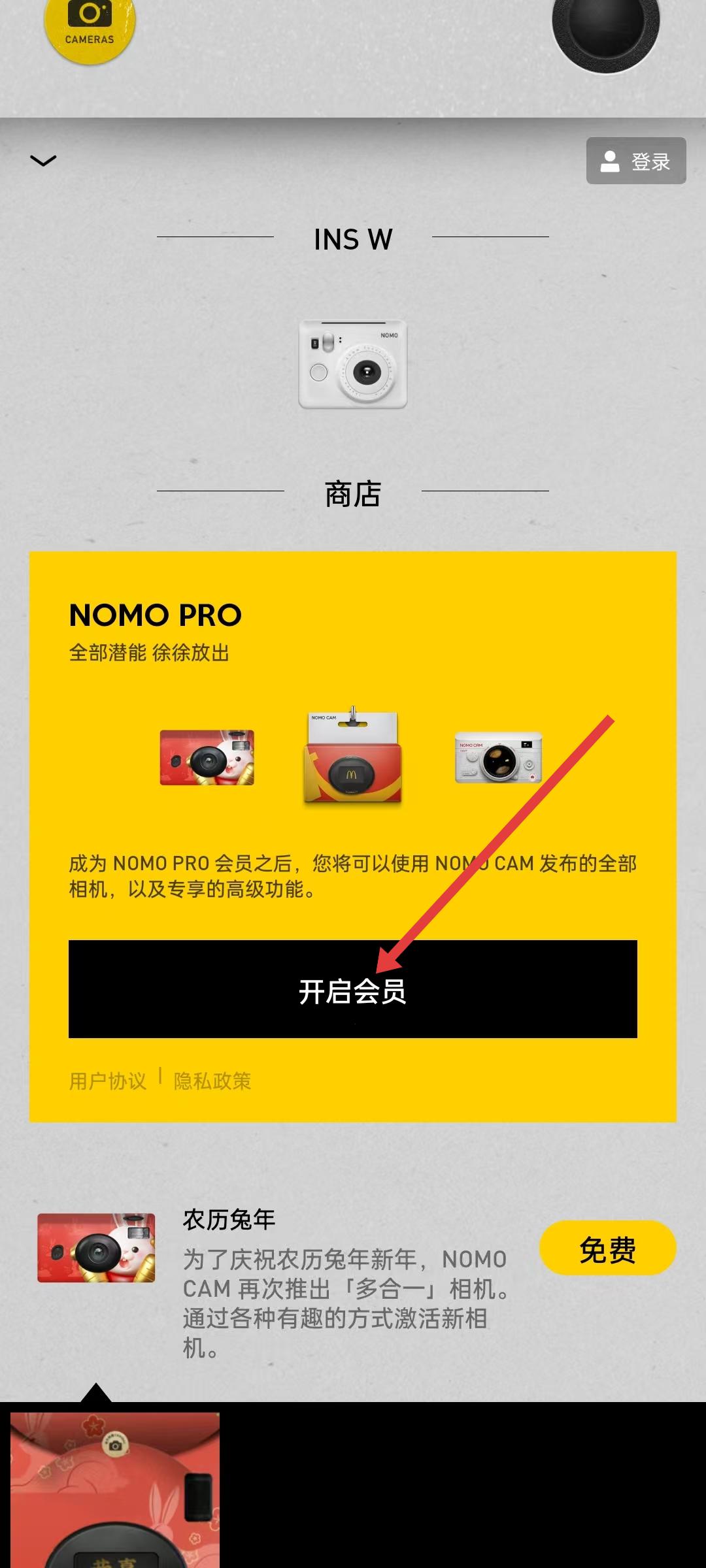 2、應用內可看到NOMO PRO會員推廣區域,點擊開啟會員按鈕,可了解成為會員后能使用全部相機及專享高級功能的權益。