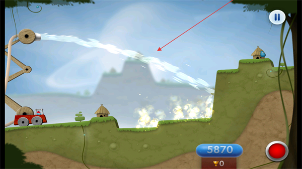 2、進入游戲場景后觀察著火區域的位置和地形,通過滑動屏幕等操作,調整消防車噴水裝置的角度向著火點噴水滅火。