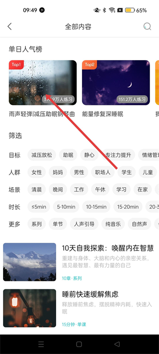 3、全部內容界面,可查看單日人氣榜的練習課程,如雨聲輕彈減壓助眠鋼琴曲等,還可通過目標、人群、場景、時長等篩選條件,找到適合自己的練習內容。