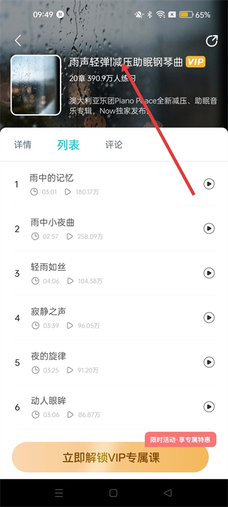 4、雨聲輕彈減壓助眠鋼琴曲界面,該課程為VIP內容,有雨中的記憶、雨中小夜曲等多個曲目,可查看每首曲目的時長和練習人數,還可參與限時活動解鎖VIP專屬課。