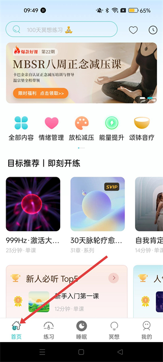 2、點擊首頁選項,進入首頁界面,可看到搜索框,還有MBSR八周正念減壓課等推薦內容,有全部內容、情緒管理、放松減壓等分類入口,以及目標推薦的練習課程。