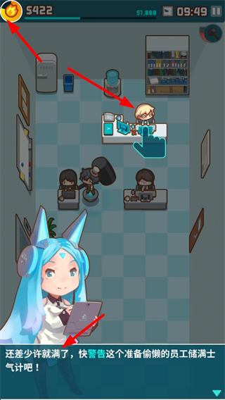 4、根據提示還差少許就滿了,快警告這個準備偷懶的員工儲滿士氣值吧,點擊對應的員工工作桌,提升士氣計進度以推進經營。