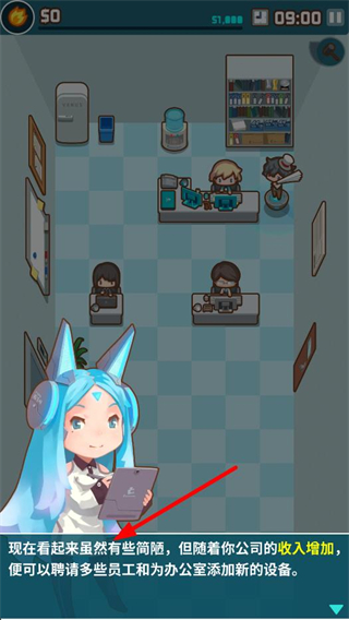 1、進入游戲看到提示現在看起來雖然有些簡陋但隨著你公司的收入增加便可以聘請多些員工和為辦公室添加新的設備,了解經營核心是積累收入升級公司。