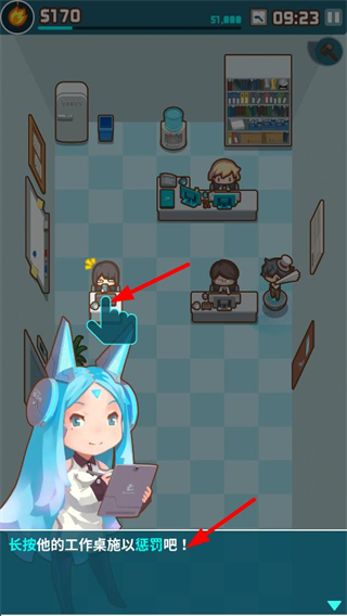 3、看到提示長按他的工作桌施以懲罰吧,長按對應的工作桌,對懈怠的員工進行懲罰,維持員工的工作狀態。