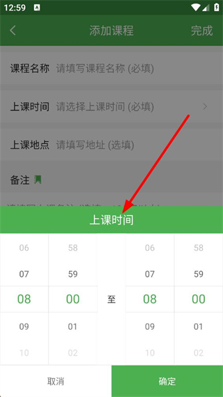3、點擊上課時間選項,彈出時間選擇面板,可選擇具體的上課時段,設置完成后點擊確定,即可完成上課時間的配置。