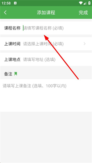 2、進入添加課程頁面,需填寫課程名稱、選擇上課時間均為必填項,還可選填上課地點及備注信息,完成后點擊完成即可添加課程。