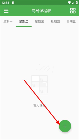 1、進入簡易課程表頁面,可切換周一至周五的課表視圖,當前顯示暫無課程,點擊右下角加號按鈕,即可進入添加課程的操作界面。
