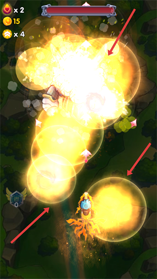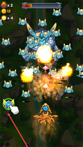 1、操控飛行角色,面對大量敵人,可點擊技能按鈕釋放技能,與敵人展開戰斗,同時注意躲避敵人攻擊。